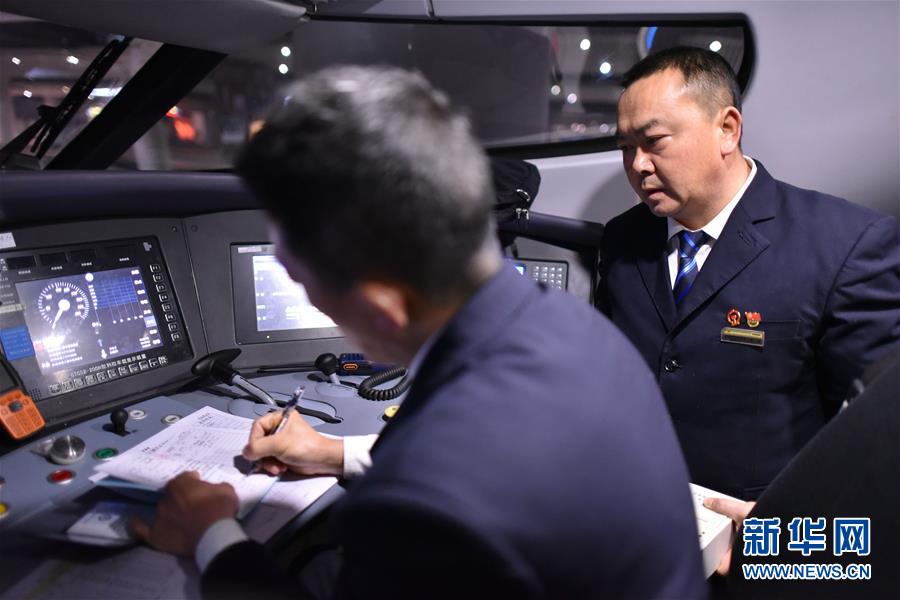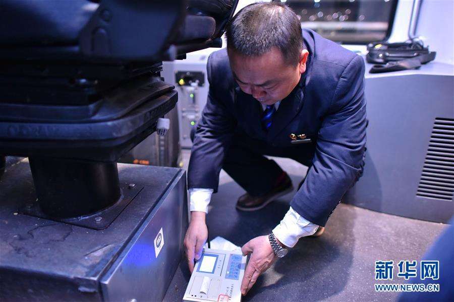 2月1日,陳輝在DJ8841次動(dòng)車組駕駛艙內(nèi)安裝便攜式線路檢查儀。新華社記者 歐東衢 攝 -