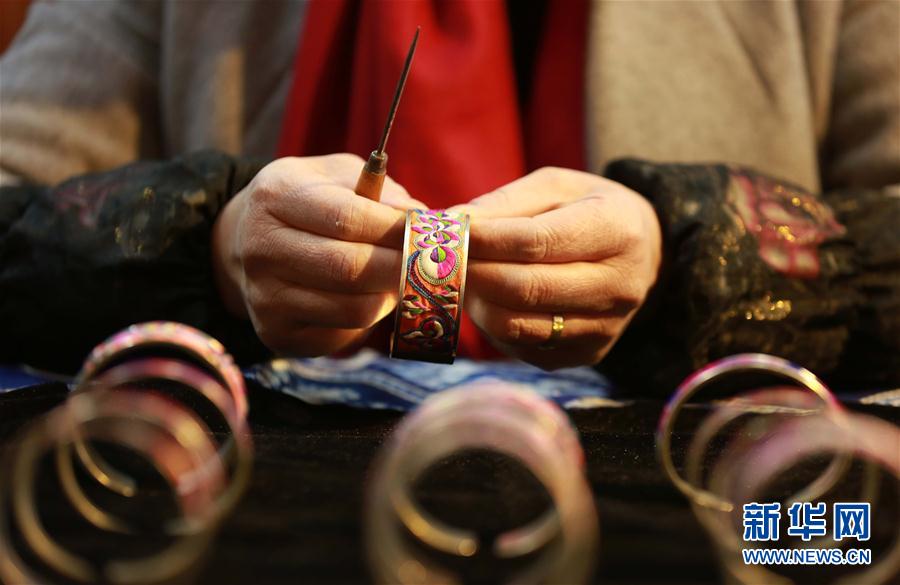 2月6日,在貴州省黎平縣一家手工銀飾店,侗族繡娘丁明煥組裝創(chuàng)意刺繡銀飾手鐲。近年來(lái),貴州省黔東南苗族侗族自治州黎平縣大力發(fā)展文化創(chuàng)意產(chǎn)業(yè),鼓勵(lì)和扶持當(dāng)?shù)乩C娘、手工藝人把民族刺繡、銀飾等設(shè)計(jì)成為具有當(dāng)?shù)匚幕厣纳唐罚瑤?dòng)群眾致富增收。新華社發(fā)(楊代富 攝) -
