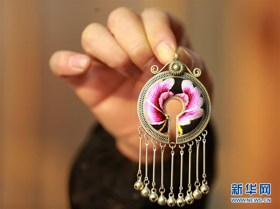2月6日,在貴州省黎平縣一家手工銀飾店,侗族繡娘丁明煥展示創(chuàng)意刺繡銀飾耳環(huán)。近年來(lái),貴州省黔東南苗族侗族自治州黎平縣大力發(fā)展文化創(chuàng)意產(chǎn)業(yè),鼓勵(lì)和扶持當(dāng)?shù)乩C娘、手工藝人把民族刺繡、銀飾等設(shè)計(jì)成為具有當(dāng)?shù)匚幕厣纳唐罚瑤?dòng)群眾致富增收。新華社發(fā)(楊代富 攝) -
