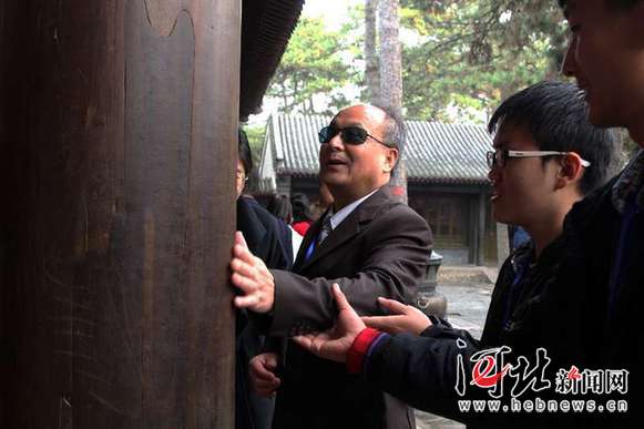 10月15日是第34個國際盲人節(jié),承德市雙橋區(qū)舉辦了一系列公益活動,旨在讓更多盲人參與社會生活,搭建盲人之間、盲人與普通人之間的溝通平臺。圖為一位盲人正在志愿者的引導(dǎo)下感受避暑山莊景物。 記者陳寶云攝