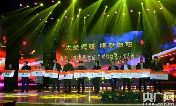 央廣網(wǎng)保定2月1日消息(記者孟曉光 通訊員 郭英焜) “這是心的呼喚,這是愛的奉獻,這是人間的春風,這是生命的源泉……”日前,河北省曲陽縣慈善協(xié)會成立暨扶貧義捐文藝演出在曲陽永寧會堂舉行,在“大愛無疆 情動曲陽”扶貧義捐現(xiàn)場,社會各界當場捐款2597.6966萬元。