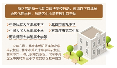 去年12月,新區(qū)啟動“千年大計、教育先行”三年提升計劃,提出到2020年,力爭實(shí)現(xiàn)辦學(xué)條件大改善、教師隊伍素質(zhì)大提升、教育教學(xué)質(zhì)量大提高。今年3月,北京市援助雄安新區(qū)辦學(xué)項目啟動,北京市朝陽區(qū)實(shí)驗小學(xué)雄安校區(qū)、北京市第八十中學(xué)雄安校區(qū)、北京市六一幼兒院雄安院區(qū)、北京市海淀區(qū)中關(guān)村第三小學(xué)雄安校區(qū)掛牌成立。除北京與新區(qū)對接的4所學(xué)校外,北京市還將通過“交鑰匙”方式支持新區(qū)公共服務(wù)水平提升。