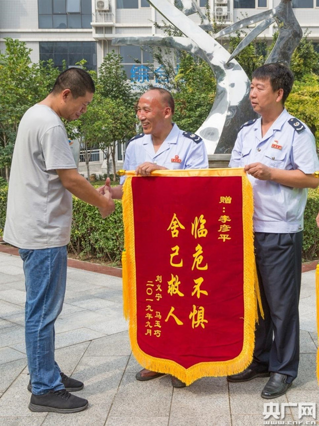 李彥平(中)接受獲救孩子父親贈送的錦旗(央廣網(wǎng)發(fā) 通訊員徐國良 攝)