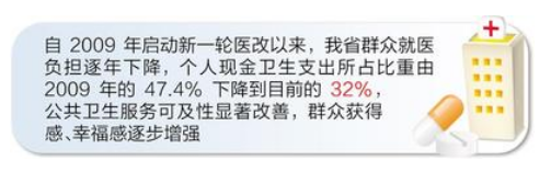 11月14日,記者從省政府新聞辦召開的《關(guān)于進一步深化醫(yī)藥衛(wèi)生體制改革的意見》新聞發(fā)布會上獲悉,自2009年啟動新一輪醫(yī)改以來,我省群眾就醫(yī)負擔(dān)逐年下降,個人現(xiàn)金衛(wèi)生支出所占比重由2009年的47.4%下降到目前的32%,公共衛(wèi)生服務(wù)可及性顯著改善,群眾獲得感、幸福感逐步增強。