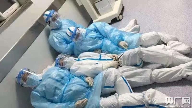 1月6日凌晨5時,換崗后準備脫下隔離服的醫(yī)護人員坐在病區(qū)外走廊短暫休息。