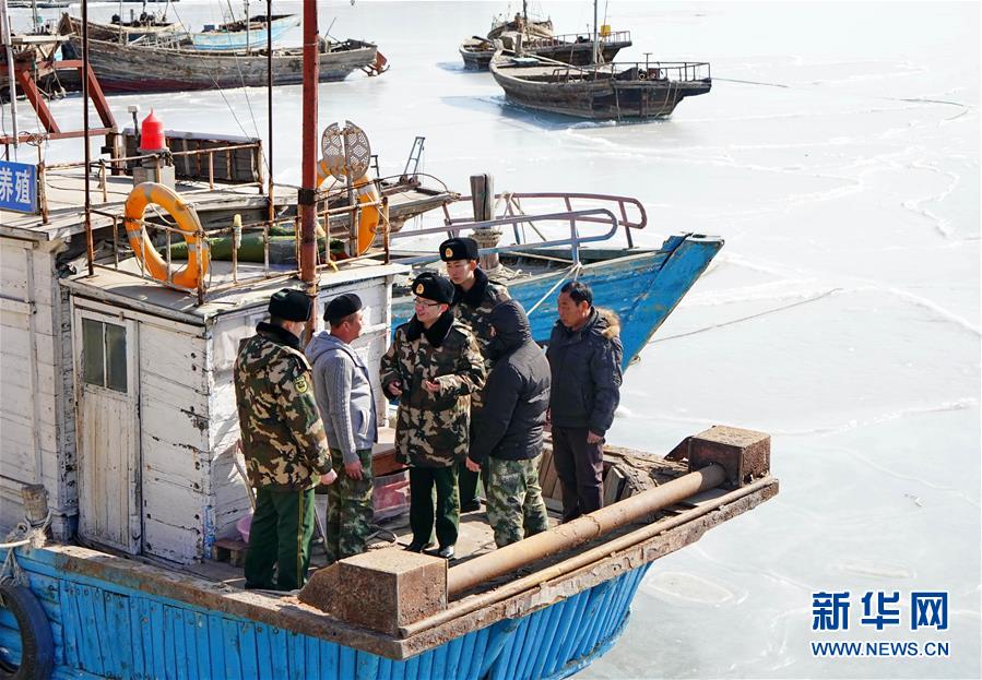 1月29日,河北省秦皇島邊防支隊北戴河邊防派出所官兵在轄區(qū)漁船碼頭提醒漁民寒潮冰期安全事項。新華社記者 楊世堯 攝 -