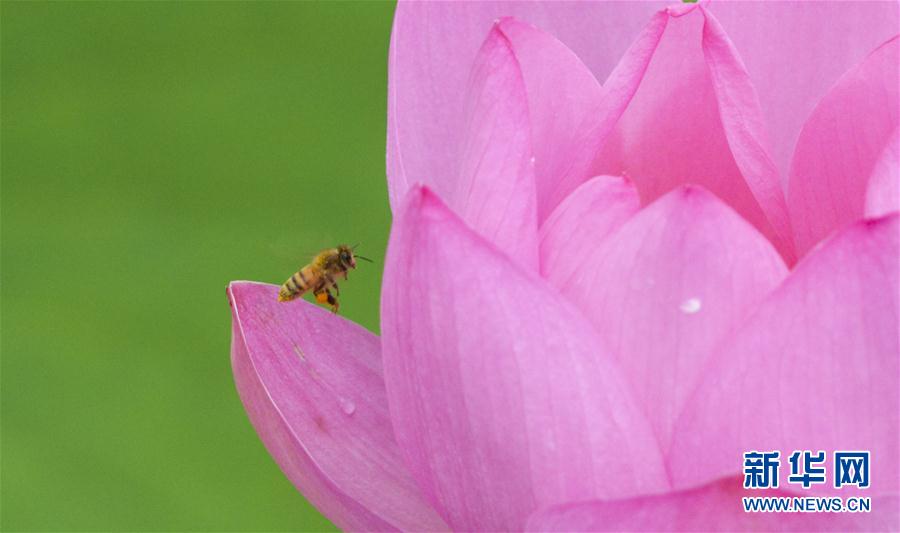 在河北省遵化市團瓢莊鄉(xiāng)山里各莊村,一只蜜蜂飛舞在荷花間(7月1日攝)。新華社發(fā)(劉滿倉 攝)