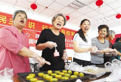9月17日,石家莊市譽(yù)天下社區(qū)的居民一起做月餅迎中秋。記者趙海江 攝