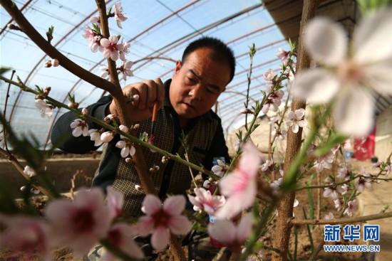 2月26日,甘肅酒泉敦煌市七里鎮(zhèn)秦家灣村農(nóng)民在溫室中為桃花授粉。 春日時(shí)節(jié),人們忙于生產(chǎn)勞動(dòng),為新一年的豐收和美好生活打下基礎(chǔ)。 新華社發(fā)(張曉亮 攝)