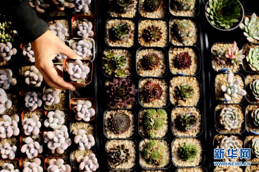 2月28日,河北省巨鹿縣南街村村民在大棚內(nèi)擺放多肉植物。近年來(lái),河北省巨鹿縣大力發(fā)展特色種植業(yè),依托當(dāng)?shù)鼗ɑ苊缒井a(chǎn)業(yè)資源優(yōu)勢(shì),鼓勵(lì)農(nóng)民打造多肉植物生產(chǎn)研發(fā)基地和休閑旅游基地,并結(jié)合市場(chǎng)需求推行“線上”和“線下”相結(jié)合的銷售模式,為農(nóng)民拓寬了增收渠道。 新華社記者 牟宇 攝