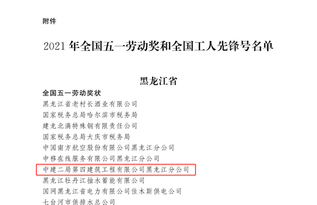 央廣網(wǎng)哈爾濱4月29日消息(記者龐淼 通訊員袁士卿)4月27日,中華全國總工會(huì)發(fā)布了關(guān)于表彰2021年全國五一勞動(dòng)獎(jiǎng)和全國工人先鋒號(hào)的決定,中建二局四公司黑龍江分公司榮獲全國五一勞動(dòng)獎(jiǎng)狀。