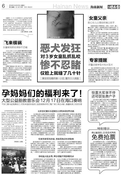 11月19日,在瓊海嘉積鎮(zhèn)前進街廉租房小區(qū)院內(nèi),3歲女童阿萌被一條阿拉斯加雪橇犬抓咬得面目全非。本報關于此事的引起讀者的廣泛關注。受害女童的父母表示,將追究狗主人的相關責任。部分瓊海市民希望政府有關部門盡快出臺養(yǎng)犬相關管理辦法,規(guī)范市民的養(yǎng)犬行為,避免類似悲劇重演。