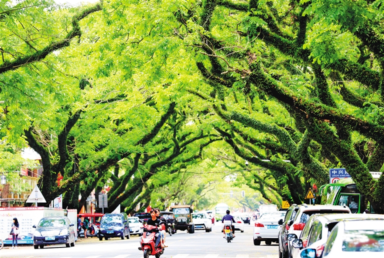 瓊海中原鎮(zhèn)藤蘿雨樹相映,成夏日的一道風(fēng)景。海南日報記者 陳元才 攝