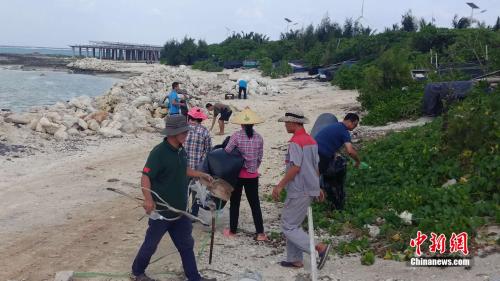 圖為島礁巡查員在趙述島清理島礁垃圾。趙述島島長(zhǎng)梁鋒供圖
