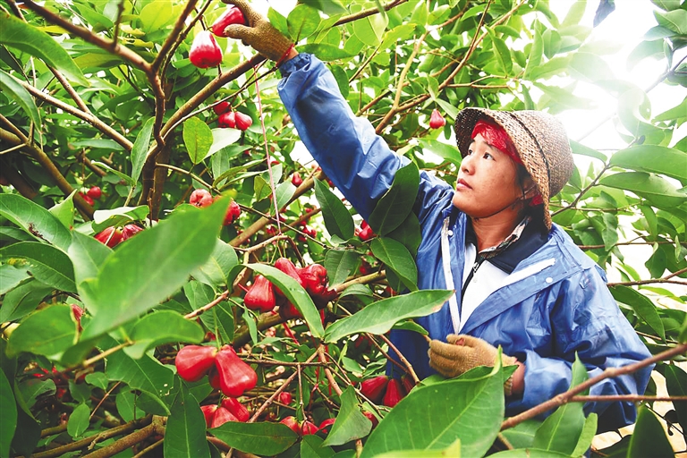 茄苪村村民在蓮霧基地采摘蓮霧。海南日?qǐng)?bào)記者 張期望 通訊員 劉平 攝