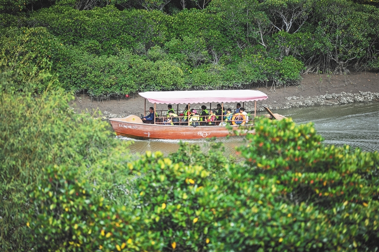 游客坐船游覽?谑袞|寨港紅樹林旅游區(qū)。海南日報記者 袁琛 攝