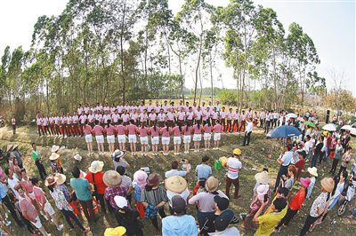 2月19日,在儋州市光村鎮(zhèn)的一處橡膠林里,當(dāng)?shù)卮迕衽牌痖L(zhǎng)隊(duì)唱起調(diào)聲,慶祝元宵佳節(jié)。 海南日?qǐng)?bào)記者 陳元才 通訊員 朱鼎甲 攝