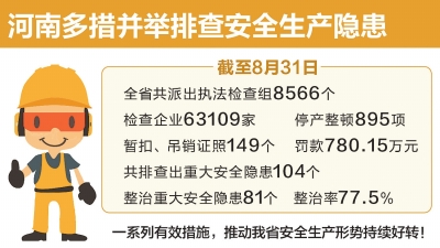 我省各地及有關(guān)部門(mén)堅(jiān)持大檢查與嚴(yán)執(zhí)法相結(jié)合,加大隱患排查治理力度,依法嚴(yán)厲打擊各類(lèi)違法違規(guī)行為,徹底整治了一批重大事故隱患。截至8月31日,全省共派出執(zhí)法檢查組8566個(gè),檢查企業(yè)63109家,停產(chǎn)整頓895項(xiàng),暫扣、吊銷(xiāo)證照149個(gè),罰款780.15萬(wàn)元;共排查出重大安全隱患104個(gè),已整治81個(gè),整治率77.5%。