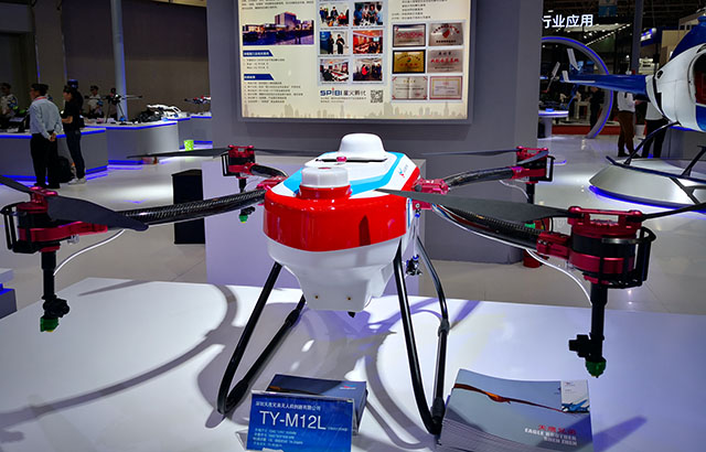 天鷹兄弟集團應(yīng)組委會邀請,攜最新自主研發(fā)的多旋翼植保無人機TY-M12L精彩亮相2019年中國·廊坊國際經(jīng)濟貿(mào)易洽談會,受到政府領(lǐng)導(dǎo)及與會觀眾的高度關(guān)注,F(xiàn)場負責(zé)人毛海興介紹這款被稱為“長腦的打藥神器”藥箱容量為12升,續(xù)航時間是18-25分鐘,作業(yè)效率為70-90畝每小時;獨創(chuàng)C型機臂創(chuàng)新設(shè)計,一步式折疊收納,運輸更便捷;全機身模塊化設(shè)計,便于拆裝與維修,維護成本低;機身采用工業(yè)三防設(shè)計,在惡劣作業(yè)環(huán)境下也能正常運作;同時配備了智能化噴灑系統(tǒng),可針對不同作物及環(huán)境進行精準噴灑;支持全自主飛行控制及夜航作業(yè)飛行。