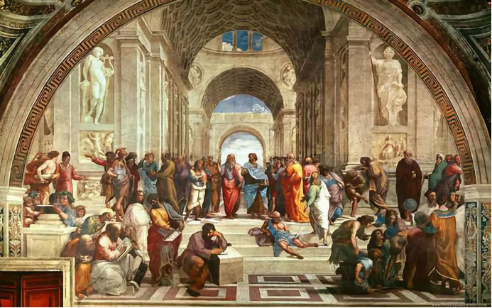 意大利畫家拉斐爾·桑西于1510~1511年創(chuàng)作的一幅壁畫作品《雅典學(xué)院》,現(xiàn)收藏于意大利梵蒂岡博物館。該畫以古希臘哲學(xué)家柏拉圖舉辦雅典學(xué)院之逸事為題材,以極為兼容并蓄、自由開放的思想,打破時空界限,把代表著哲學(xué)、數(shù)學(xué)、音樂、天文等不同學(xué)科領(lǐng)域的文化名人會聚一堂,以回憶歷史上黃金時代的形式,寄托了作者對美好未來的向往,表達(dá)了對人類追求智慧和真理者的集中贊揚。