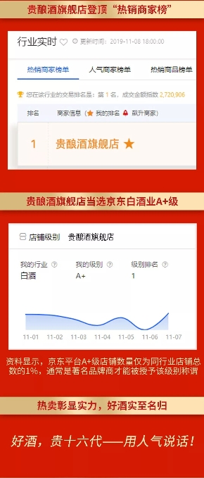 在京東全球好物節(jié)上,中國貴酒集團旗下貴釀酒旗艦店更是賣爆了!該店一度登頂京東“熱銷商家榜”,當選京東白酒業(yè)A+級店鋪。資料顯示,京東A+級店鋪數(shù)量僅為同行業(yè)店鋪總數(shù)的1%,通常是著名品牌商才被授予該稱謂。