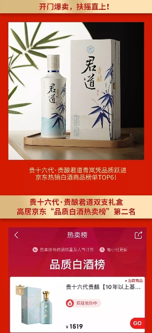 貴十六代·貴釀青嵐一度榮登京東“品質白酒榜TOP2”,一度入選“醬香型白酒熱賣榜NO.10”,憑品質躍進京東熱銷白酒商品榜TOP6。貴十六代·貴釀君道雙支禮盒一度榮居京東“品質白酒熱賣榜”第二名。