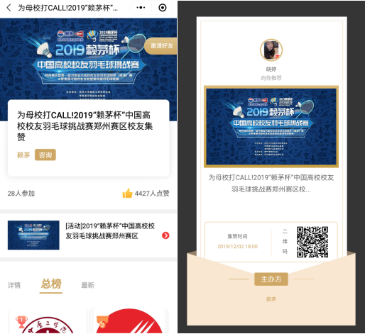 2019“賴茅杯”中國高校校友羽毛球挑戰(zhàn)賽鄭州賽區(qū)暨第一屆河南省內(nèi)高校校友會羽毛球團體(邀請)賽&常青藤河南校友會聯(lián)盟第四屆羽毛球聯(lián)賽“為母校打call”活動現(xiàn)已開啟,快進入“不賴活動”小程序,或在賴茅公眾號回復“鄭州投票”,點贊你支持的學校吧!