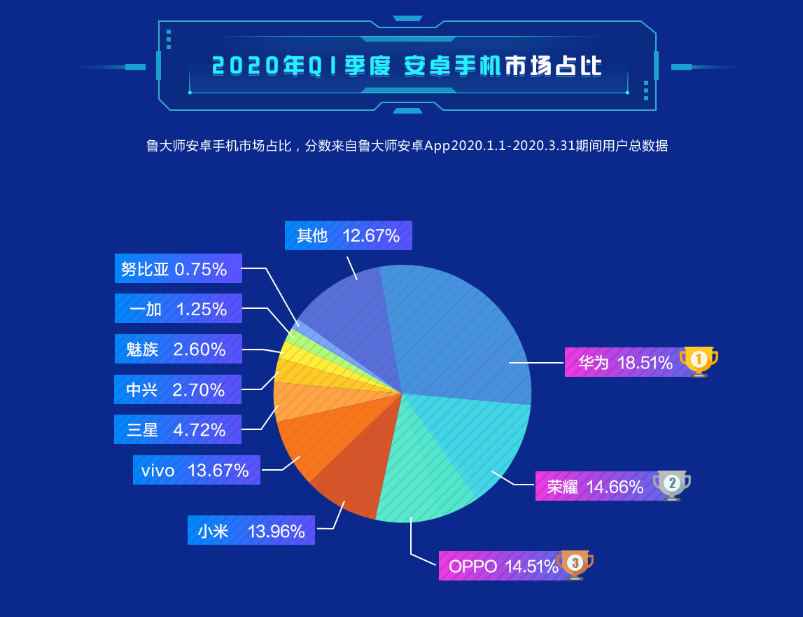 最新發(fā)布的魯大師2020年Q1季度報告中,魯大師新增安卓手機市場,華為以18.51%的絕對優(yōu)勢占據(jù)手機市場份額第一。緊隨其后的是榮耀和OPPO,市場占比分別為14.66%和14.51%,而小米則被OPPO超越以13.97%的份額排名第四。
