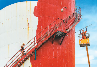 4月22日,中國石化安慶分公司工人為生產(chǎn)設備刷新漆。程周平攝(人民視覺)