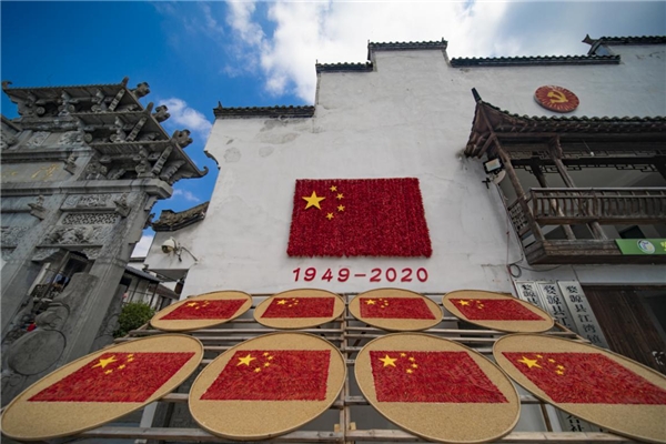 江灣廣場(chǎng)曬秋,用辣椒和玉米拼成國(guó)旗圖案,以當(dāng)?shù)卮迕裉赜械那飼穹绞綉c祝祖國(guó)71歲生日。逛累了就到公社食堂買一張飯票,吃一回大鍋飯,回憶一下60、70年代的時(shí)光。