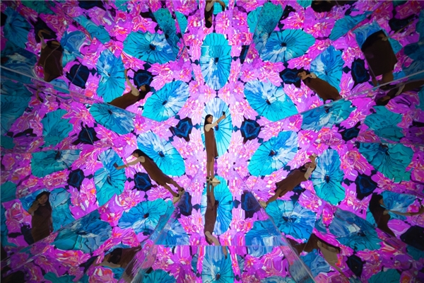 非遺萬(wàn)花筒,巨大的萬(wàn)花筒五光十色,不僅隨著音樂(lè)變換著不同圖案里面更藏著婺源各種非遺文化元素。