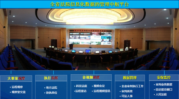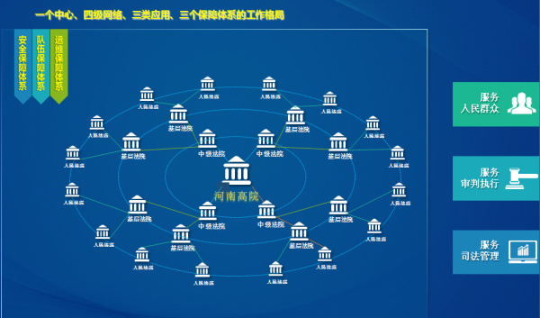 先后建成的信息集控中心、核心機(jī)房、執(zhí)行指揮中心、視頻綜合管理監(jiān)控系統(tǒng),視頻會(huì)議系統(tǒng)、高清數(shù)字法庭系統(tǒng)、辦案區(qū)安防系統(tǒng)、涉訴信訪接待系統(tǒng)、12368平臺(tái)、OA辦公系統(tǒng)、移動(dòng)辦公辦案系統(tǒng)、數(shù)據(jù)分析平臺(tái)等,使案件從立案到結(jié)案流程數(shù)據(jù)全程可視;法律文書(shū)從制作、糾錯(cuò)、屏蔽、上網(wǎng)一鍵完成;庭審活動(dòng)實(shí)現(xiàn)了全程的錄音錄像。實(shí)現(xiàn)了“審判管理網(wǎng)絡(luò)化,電子審核簽發(fā)化,庭審活動(dòng)科技化,機(jī)關(guān)辦公無(wú)紙化”,通過(guò)信息化建設(shè)增進(jìn)了資源共享、提高審判效率、節(jié)約審判資源、方便群眾訴訟的目的,形成了網(wǎng)絡(luò)全互聯(lián),業(yè)務(wù)廣覆蓋、數(shù)據(jù)大集中、資源共享用的河南法院信息化工作格局。 ?