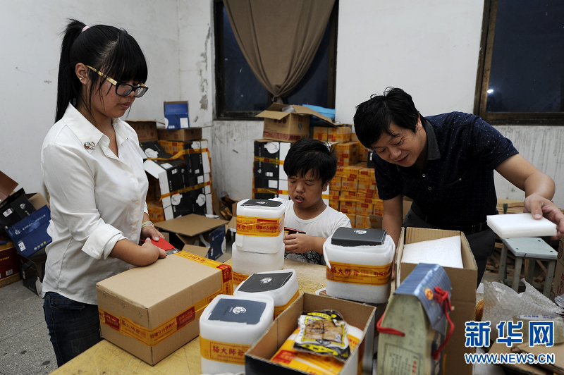 9月16日,來自河南周口的周夢(mèng)雪(左)與來自紹興的朱健愷(中)、夏建慶(右)在倉庫內(nèi)打包黃酒,他們?nèi)齻(gè)都是殘疾人。周夢(mèng)雪是2013年在這里參加培訓(xùn)并且留了下來,朱健愷是這里的培訓(xùn)老師,平時(shí)也在店里工作,而夏建慶也有自己的一家淘寶店。