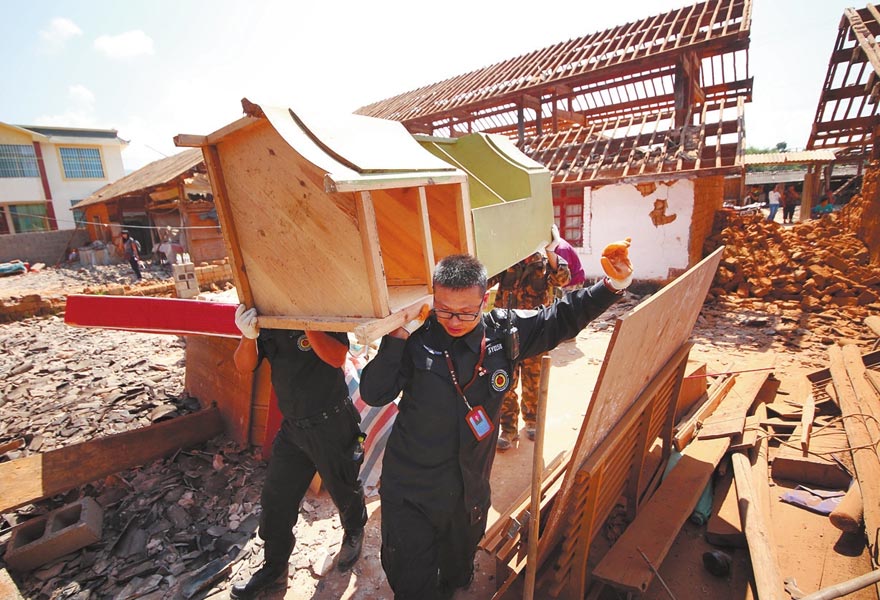 10月10日上午,在景谷傣族彝族自治縣永平鎮(zhèn)芒費(fèi)村七七小組,受災(zāi)村民李發(fā)熒見到神鷹隊(duì)員著急地說,她家房子在這次地震中倒了5間,很多東西都還在坍塌的房子里,希望救援隊(duì)能夠幫他們將東西搬到安全的地方。聞此,十余名救援隊(duì)員趕到其家中,為其搶救受災(zāi)物資,在前半小時搶救過程中神鷹隊(duì)員經(jīng)歷了2次余震,最終成功將物資搬到安全處。圖為救援隊(duì)員正幫災(zāi)民從受損的房屋內(nèi)“搶救”物品。(記者 胡公崗 文 王亞鴿 攝影)