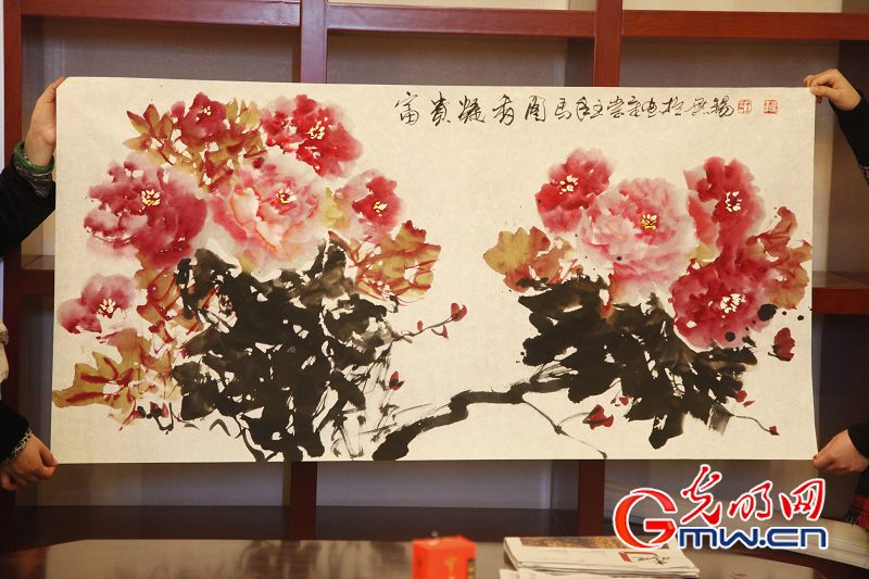 據(jù)介紹,聯(lián)合國教科文組織會議大廳懸掛的《華夏神韻》牡丹圖就是王崇章的作品。2010年,他應(yīng)邀為人民大會堂創(chuàng)作巨幅花鳥畫作品《國色天香》;2011年又為中南海創(chuàng)作了《紫氣東來》、《春滿人間》、《凝香》等一系列牡丹作品。(陳敏 通訊員 陸云婷)