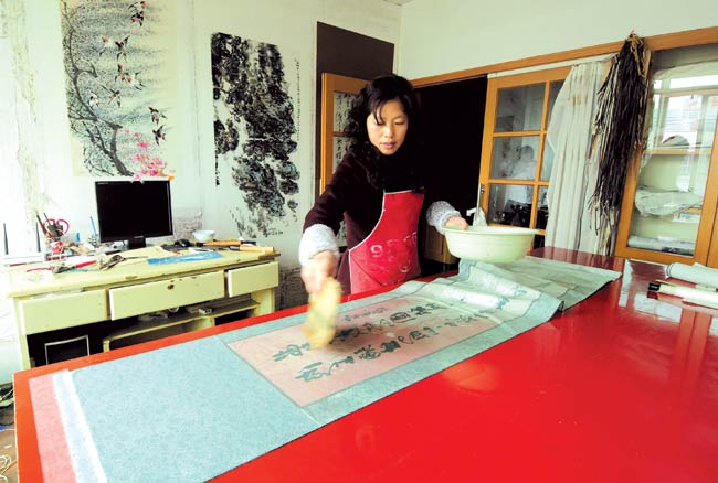 “宣紙和漿糊的質(zhì)量好,可延長(zhǎng)書畫的保存期!绷焊F秸f(shuō),她裝裱用的漿糊都是自己特制的,宣紙也是自己到宣紙生產(chǎn)廠家定制的。刷漿糊時(shí),要先用手試其厚薄,漿糊用得多,裱好的書畫容易發(fā)硬、出現(xiàn)瓦卷;漿糊用得少,則容易脫層。