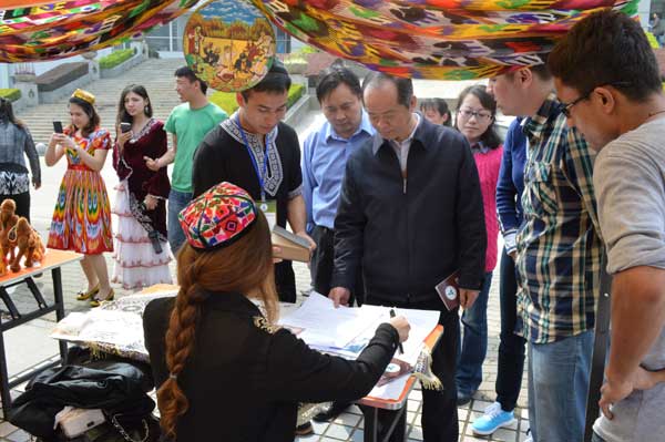 參觀中,校黨委書(shū)記張中華認(rèn)真聽(tīng)、看和詢問(wèn)各民族所展示的動(dòng)人神話傳說(shuō)、珍藏典籍、特色民族服飾、民族文字和繪畫(huà)作品,品嘗各民族特色傳統(tǒng)美食。當(dāng)他走到哈薩克族的展示區(qū)時(shí),哈族的一對(duì)姑娘、小伙兒正在現(xiàn)場(chǎng)模擬民族結(jié)婚嫁娶習(xí)俗,一對(duì)“新人”盛情邀請(qǐng)他做“主婚人”,親身體驗(yàn)和感受民族婚嫁文化。