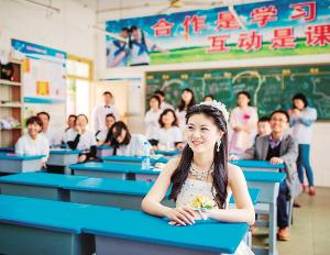 溫婉秀美的新娘坐在前排,不時(shí)抬頭冥想。新郎則坐在后排,悄悄地關(guān)注著“女神”的一舉一動(dòng)。新郎親吻了新娘,圍觀的“同學(xué)們”起哄叫好聲一片,“現(xiàn)在把以前上學(xué)的遺憾補(bǔ)起!