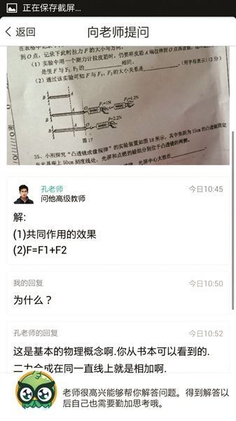 一款較為火爆的解題神器——“問他作業(yè)”,進入應用主頁后,頁面上顯示“我要提問”的指示圖標,點擊進入后,有兩個“提問方式”供選擇,一為“向?qū)W霸提問”,二為“向老師提問”,記者點選了“向老師提問”,上面注明需“付費”,記者注冊并充值后進入正式提問頁面,需填寫“選擇年級和學科”后,“上傳圖片或輸入問題”。記者隨機拍了一道初二物理“力學”試題上傳,5分鐘后一位標注為“問他高級教師”的孔老師給了答案,答案中沒有任何解析說明。記者隨后點了回復,提問“為什么?”孔老師2分鐘后回復,“這是基本的物理概念啊,你從書本可以看到的,二力合成在同一直線上就是相加啊!闭麄解題結束后,系統(tǒng)提醒“是否采納答案”,點擊“采納”后,扣除了2個問豆,即2塊錢。