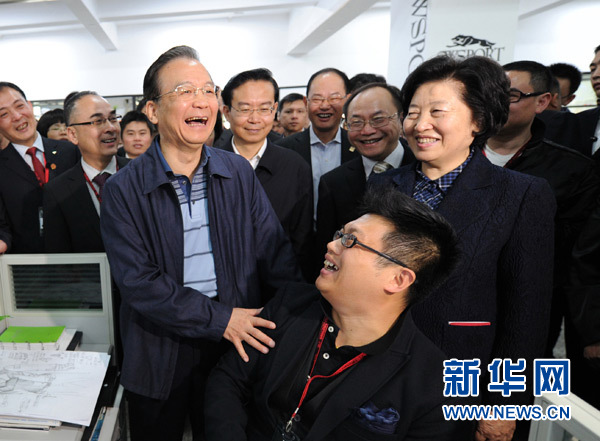 4月1日至3日,中共中央政治局常委、國務(wù)院總理溫家寶在廣西欽州,福建泉州、莆田、福州等地就經(jīng)濟(jì)運行情況進(jìn)行調(diào)研。這是4月2日,溫家寶在泉州七匹狼體育用品公司考察時與員工親切交談。 新華社記者馬占成攝