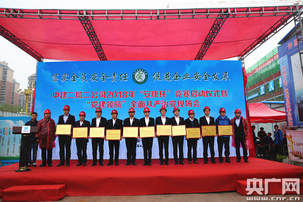 央廣網(wǎng)河南分網(wǎng)4月19日消息 櫻花漫溢,鶯蝶曼舞,建筑工地上的四月熱火朝天,正是大干的好時(shí)節(jié)。為了提高職工和農(nóng)民工的安全意識(shí),保證安全施工,推動(dòng)公司轉(zhuǎn)型升級(jí),穩(wěn)步健康發(fā)展,4月13日,公司在許昌萬(wàn)達(dá)項(xiàng)目舉行了2018年“安康杯”競(jìng)賽啟動(dòng)儀式暨“黨建領(lǐng)航”全面從嚴(yán)治黨現(xiàn)場(chǎng)會(huì)。河南省建設(shè)工會(huì)主席汪國(guó)義,陜西省建設(shè)工會(huì)主席徐富權(quán),央廣網(wǎng)河南分網(wǎng)執(zhí)行總編李永軍,西安市未央?yún)^(qū)監(jiān)察委相關(guān)領(lǐng)導(dǎo),局工會(huì)副主席田川、局黨委工作部部長(zhǎng)吳寶菊、局紀(jì)檢監(jiān)察部部長(zhǎng)丁志剛,公司黨委副書(shū)記、紀(jì)委書(shū)記、工會(huì)主席謝東東等領(lǐng)導(dǎo)參加活動(dòng)。