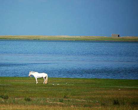 環(huán)湖東路上遠(yuǎn)看青海湖尕海畔的白馬