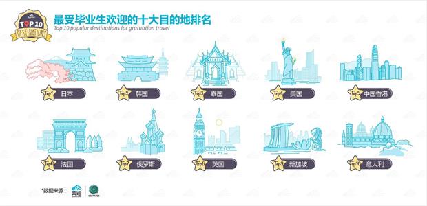據(jù)天巡數(shù)據(jù)顯示,最受學(xué)生群體歡迎的畢業(yè)旅行境外目的地前十名依次是:日本、韓國(guó)、泰國(guó)、美國(guó)、香港、法國(guó)、俄羅斯、英國(guó)、新加坡和意大利。亞洲國(guó)家占據(jù)熱門目的地TOP3,日本、韓國(guó)和泰國(guó)的搜索頻率也遠(yuǎn)超其他境外目的地,其中日本的搜索量是其他目的地兩倍;泰國(guó)等東南亞目的地憑借低廉的出行價(jià)格以及便利的交通,仍然是學(xué)生群體畢業(yè)季旅行的熱門目的地。
