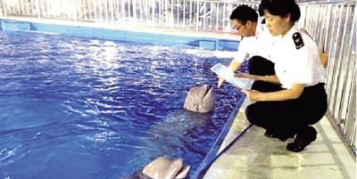 河南檢驗(yàn)檢疫局工作人員在對(duì)白鯨進(jìn)行檢疫監(jiān)管