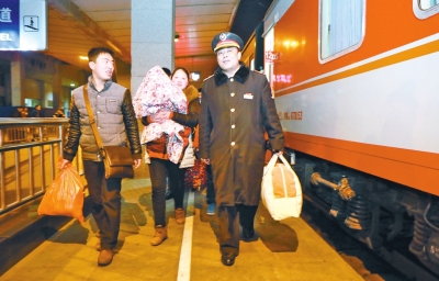 提起站臺上的丈夫,她彈了彈身上的灰,跟記者打開了話匣子!八褪悄菢,站上旅客哪個有困難,他都可積極,估計幫旅客拎上車的包也有上百個了吧!彼α诵φf,春運比較忙,我們兒子的午飯都難得給做上一頓,“剛剛給孩子打電話,讓他自己買點午飯吃,我跟他爸中午都回不去了!