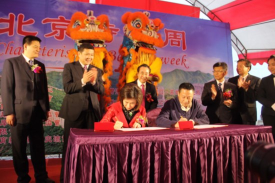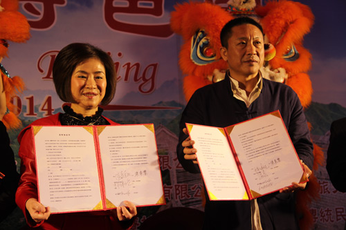 北京萬(wàn)豐小吃董事長(zhǎng)侯嘉與高雄河邊餐飲集團(tuán)董事長(zhǎng)張素鑾簽署合作協(xié)議(李婷婷攝)