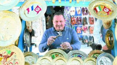 在突尼斯北部的“藍(lán)白小鎮(zhèn)”西迪布賽伊德,當(dāng)?shù)厝嗽谥谱魇止に嚻。新華社發(fā)