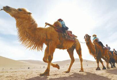 游客在絲綢之路上的敦煌鳴沙山騎駱駝。新華社發(fā)