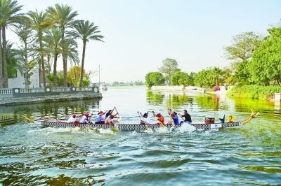 在埃及首都開羅,埃及龍舟體驗(yàn)者們?cè)谶M(jìn)行“龍舟拔河”。新華社發(fā)