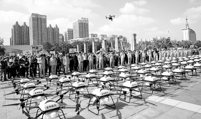 圖為千人千機小麥航空植保統(tǒng)防統(tǒng)治啟動儀式現(xiàn)場。肖敬光攝